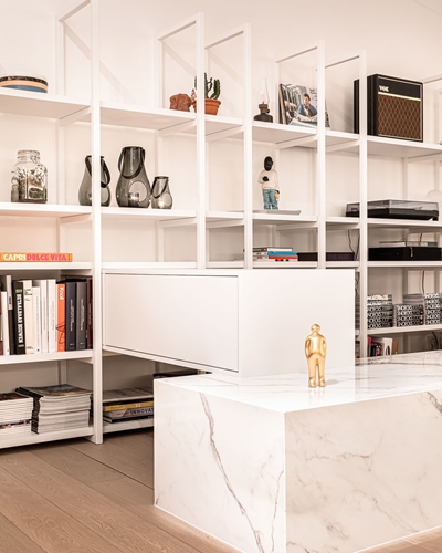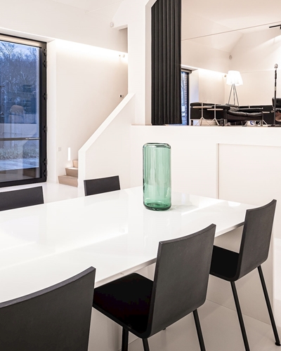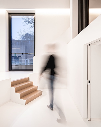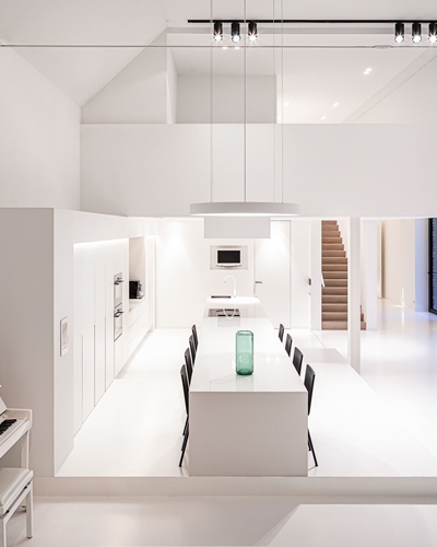 Totale verbouwing van oude toneelzaal tot woning met eigen burelen, complete ontmanteling van beide panden, nieuw alu schrijnwerk, dakbedekking, vloeropbouw, warmtepomp met vloerverwarming nieuwe maatwerk keuken, maatwerk badkamer en douchekamer, maatwerk in dressing, maatwerk in kinderkamers, inrichten van buro.
